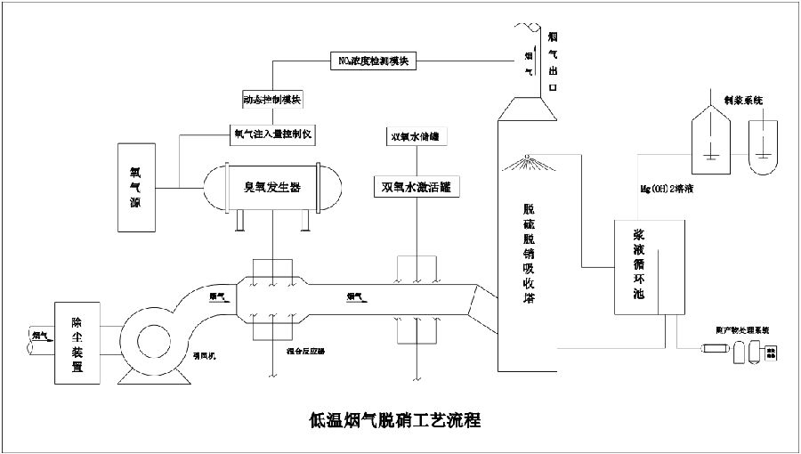 工藝原理:組合氧化法脫硝主要是利用臭氧和雙氧水的強氧化性,將不可溶的低價氮氧化物氧化為可溶的高價態(tài)氮氧化物,然后在洗滌塔內(nèi)將氮氧化物吸收,達到脫除的目的。