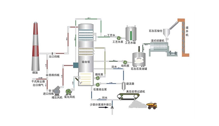 來自于鍋爐或窯爐的煙氣經過除塵后在引風機作用下進入吸收塔,吸收塔為逆流噴淋空塔結構,集吸收、氧化功能于一體,上部為吸收區,下部為氧化區,經過除塵后的煙氣與吸收塔內的循環漿液逆向接觸。系統一般裝3-5臺漿液循環泵,每臺循環泵對應一層霧化噴淋層。當只有一臺機組運行時或負荷較小時,可以停運1-2層噴淋層,此時系統仍保持較高的液氣比,從而可達到所需的脫硫效果。吸收區上部裝二級除霧器,除霧器出口煙氣中的游離水份不超過75mg/Nm3。吸收SO2后的漿液進入循環氧化區,在循環氧化區中,亞硫酸鈣被鼓入的空氣氧化成石膏晶體。同時,由吸收劑制備系統向吸收氧化系統供給新鮮的石灰石漿液,用于補充被消耗掉的石灰石,使吸收漿液保持一定的pH值。反應生成物漿液達到一定密度時排至脫硫副產品系統,經過脫水形成石膏。